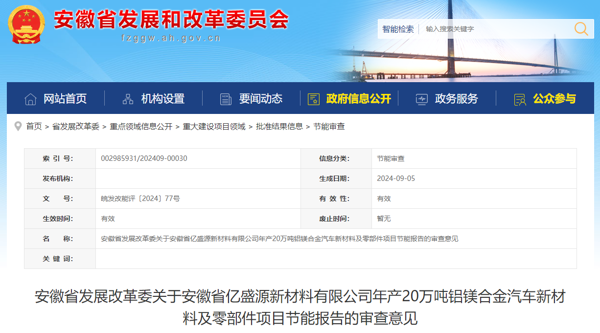 9月5日,安徽省发展改革委公开了关于安徽省亿盛源新材料有限公司年产20万吨铝镁合金汽车新材料及零部件项目节能报告的审查意见,经审查,原则同意该项目节能报告。安徽省亿盛源新材料有限公司: 池州市发展改革委《关于审查安徽省亿盛源新材料有限公司年产20万吨铝镁合金汽车新材料及零部件项目节能报告的请示》(池发改环资〔2024〕510号)及有关材料收悉。经审查,具体意见如下:原则同意该项目节能报告。 项目代码:2306-341763-04-05-307235。