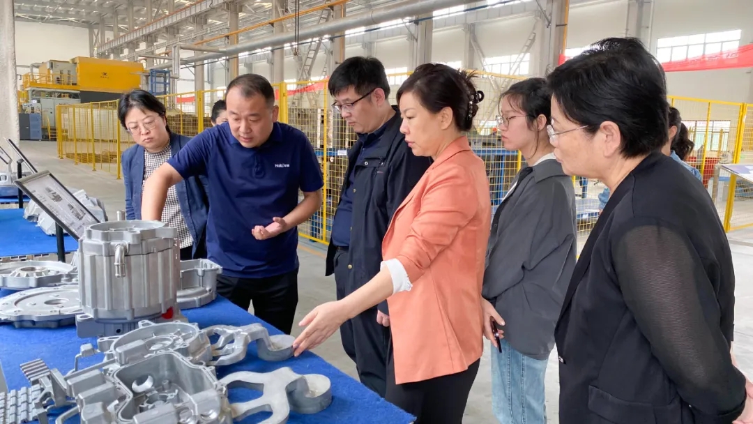 考察团先后参观了压铸车间和机加工车间,详细了解了关键工艺流程、设备配备和质量控制体系,并深入了解了产业园在项目布局规划、材料开发、技术创新、终端应用及上下游产业链协同等方面的情况。产业园负责人孙强具体介绍了公司在新能源汽车、轨道交通、5G通信及低空经济等多个制造领域取得的技术突破和应用创新成果。