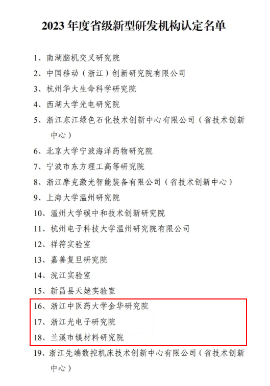近日,浙江省科技厅公布关于2023年度省级新型研发机构名单,金华市的浙江中医药大学金华研究院,浙江光电子研究院,兰溪市镁材料研究院位列其中,为金华科技创新工作再添新亮点。
