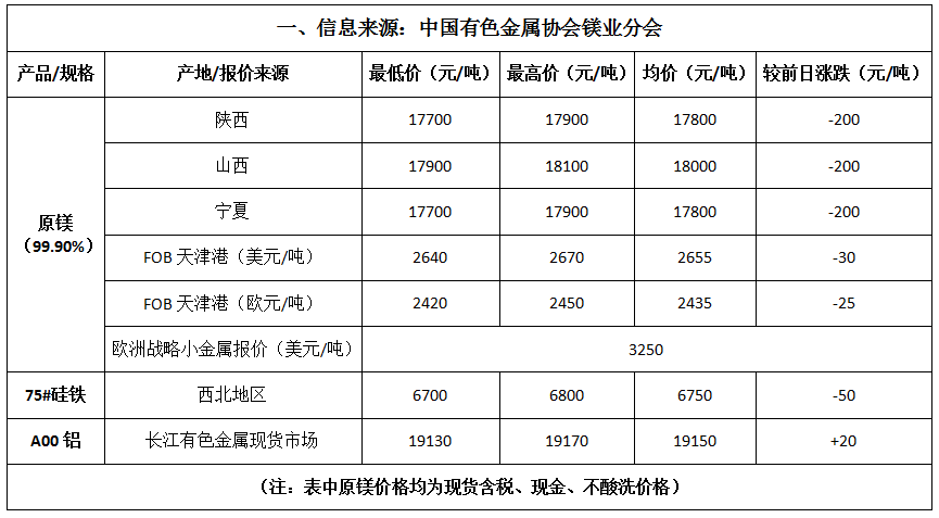 今日,金属镁市场价格较上一交易日下调,幅度为100元/吨。今日金属镁市场价格继续下降,较周初累计跌幅已达400元/吨。整体供需偏于失衡局面,导致下游客户采购较少,部分厂家库存压力较大,存在竞价出售,除刚需采购,下游多数用户“买涨不买跌”心态持续,市场观望情绪较为浓厚。目前府谷地区主流工厂价格17500-17600元/吨,实单详谈为主,由于缺乏明显利好因素支撑,部分低价成交频频显现。因市场价格相对低位,企业亏损较为严重,部分企业已暂不出货,后期存在减产、停产风险,短期内镁市弱势局面仍旧难改。