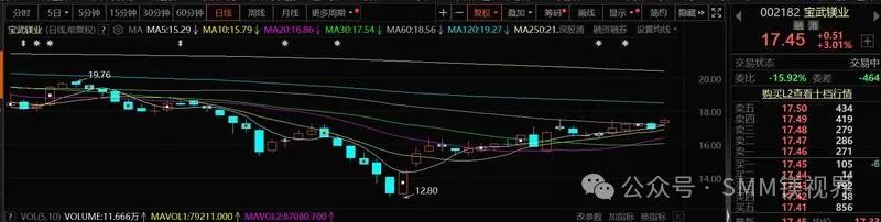 宝武镁业股价自触及前期的低点12.8元/股以后,近来整体处于上行的趋势,截至3月13日下午14:10分,宝武镁业报17.45元/股,涨3.01%。