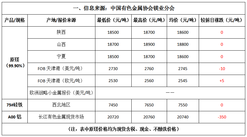今日,金属镁市场价格较上一交易日持平。今日金属镁市场价格继续偏稳运行,主要是下游接货能力不足,抵触高价心理渐起,但因生产成本相对高位,厂家让利意愿较低。目前府谷地区主流工厂价格18500-18600元/吨,实单详谈为主。下游多延续刚需采购为主,部分不急于补货客户操作谨慎,对于高价接单意愿相对较弱,整体高价成交跟进并不太理想,市场单边拉涨现象表现较为明显。目前镁价在成本线附近,部分厂家已存在亏损,原料价格持续攀升,终端虽有刺激消费政策,但利好并未传至镁市场,市场价格上行艰难,后市偏于震荡波动风险性犹存。