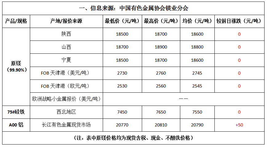 本周,镁价小幅上涨。周初,工厂受成本支撑挺价意愿强烈,市场低价货源不多,但下游用户需求有限,仍以观望为主,市场成交有限,供需矛盾僵持继续,周初镁价为18300~18700元/吨,较上周末保持不变。周中,原材料硅铁价格再度上涨,对镁价形成有力支撑,报价上调;下游用户适当下单采购,成交有所改善,镁价有所反弹,较周初约涨200元/吨。