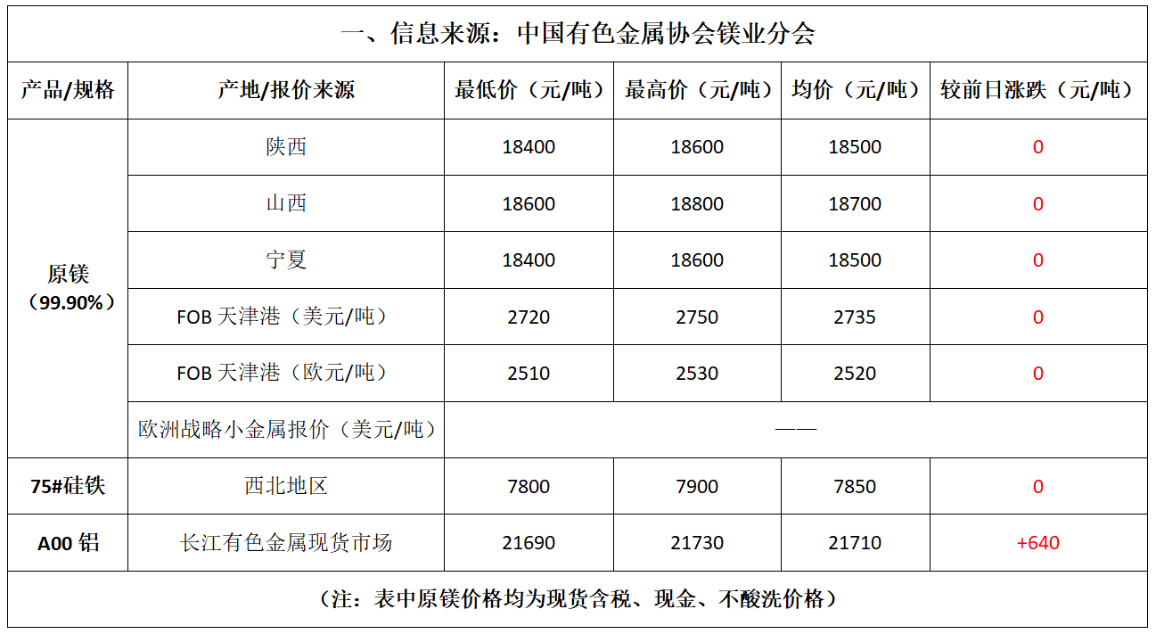 今日,金属镁市场价格较上一交易日上调,幅度为200元/吨。今日金属镁市场偏强运行,价格反弹上行,主要是部分厂家低价惜售,市场成交相对较少,但因原料价格继续上涨,下游询价增加,采购心理增强。目前府谷地区主流工厂价格18600-18700元/吨,实单详谈为主。目前原料端硅铁期货涨停,生产成本继续增加,给予镁锭生产厂家成本端强势支撑,挺价心态浓厚,而下游用户受“买涨不买跌”心理影响,采货意愿增加,部分贸易商存备货心理,短期镁锭价格仍有上行空间。