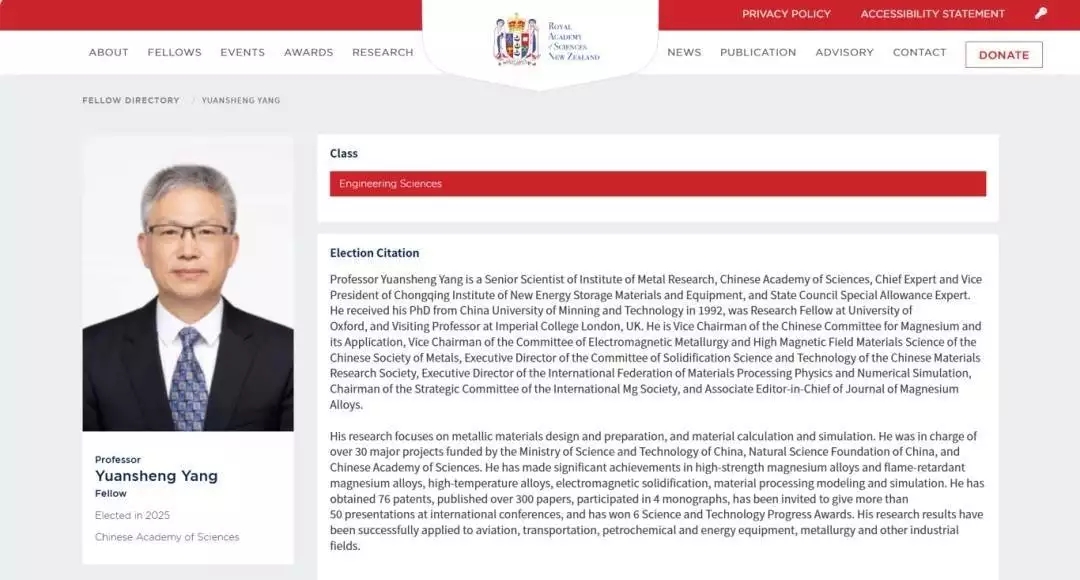 明月湖实验室首席专家副主任杨院生当选新西兰皇家科学院院士