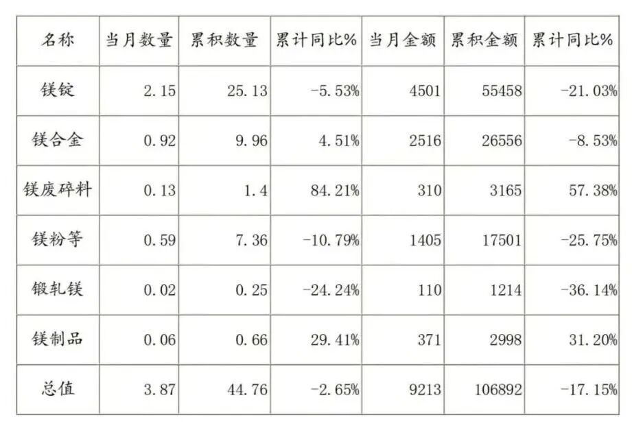 2025年12月中国各类镁产品出口统计 (单位:万吨、万美元)