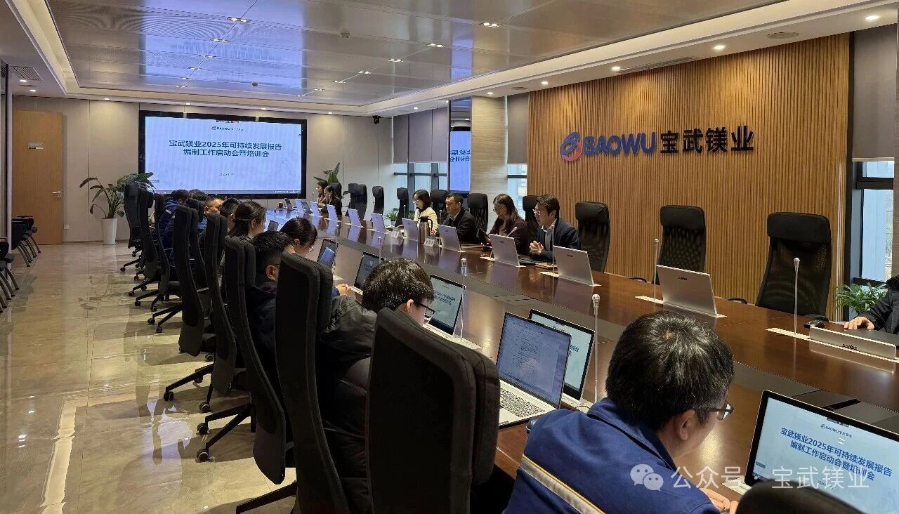 1月19日,宝武镁业顺利召开2025年可持续发展报告编制工作启动会暨培训会。会议由党群工作部主持。会议邀请责任云研究院执行院长叶柳红作辅导培训。宝武镁业党委副书记、纪委书记张楠,董事会秘书、法务合规部部长吴剑飞出席会议并讲话。宝武镁业总部各部门、各中心、各事业部、各分子公司相关人员现场或视频参加会议。