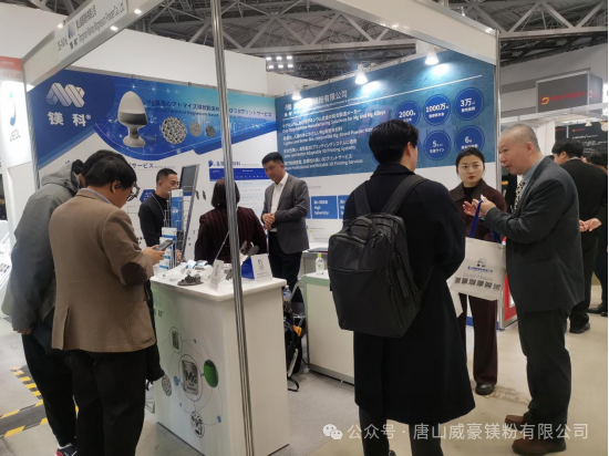 展会三天内,唐山威豪展位参观者络绎不绝,来自设备厂商、材料研发机构、高校及终端应用企业的专业人士与团队成员进行了深入交流,并现场互换了联系方式,为后续技术交流与合作奠定了良好基础。 通过面对面的沟通,唐山威豪深入理解了日本市场对镁合金粉末性能、稳定性及定制化方面的需求,也向国际客户清晰传达了公司在雾化镁及镁合金粉领域的长期技术积累和标准化生产能力。