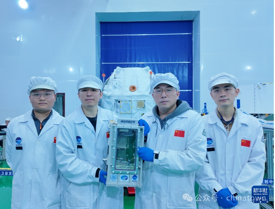 2025年12月2日,重庆大学深空探测联合研究团队在酒泉卫星发射中心与“神农开物2号”载荷舱合影。新华社发(重庆大学 供图)