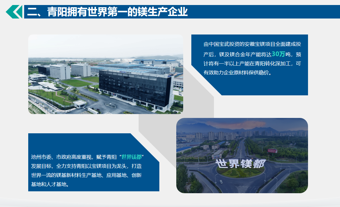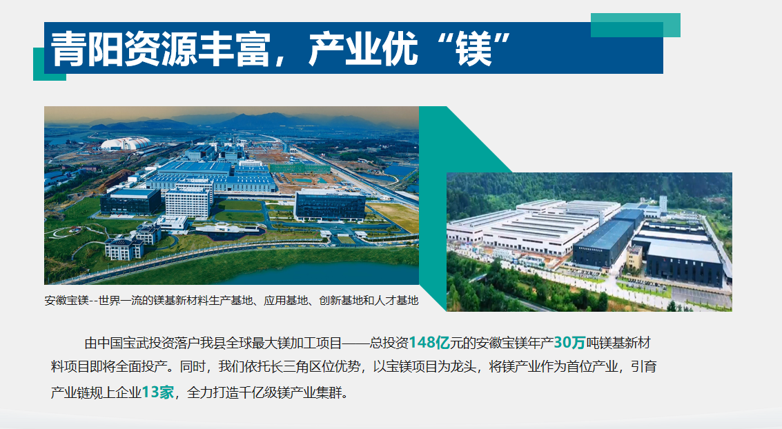同时,青阳县充分发挥原料保供、镁水直供等优势,紧盯汽车轻量化、两轮电动车等重点领域开展产业链招商,累计签约镁产业链关联项目68个、总投资435亿元,镁源动力、久航锻造等一批重点项目相继开工、投产,路飞镁业、亿盛源等一批权重企业“挑起大梁”。