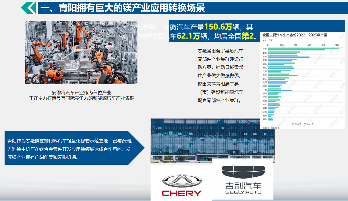 青阳县镁基新材料产业科技创新同样实现了重大跨越。“全省唯一一家省级镁基新材料产业研究院投入运行,宝镁双蓄热、底出渣镁冶炼技术获评第八届国际镁会议研发创新奖,超长型镁合金仪表盘短流程一体化压铸技术获评省科技攻坚项目。”方操胜介绍道。