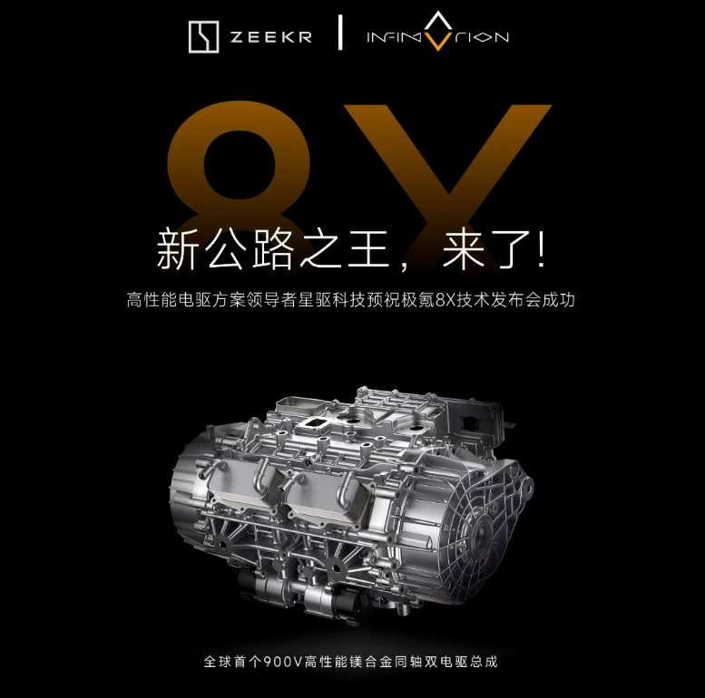 作为全球首款实现规模化量产的 900V 高压同轴双电驱总成,这套系统实现了三大核心技术的全球首创突破。这也是行业首发全系统镁合金轻量化方案,刷新量产电驱功率密度纪录:这套总成是全球唯一一款实现量产的镁合金壳体 900V 高压电驱总成,首次在量产车规级电驱系统上实现全核心结构件的高性能镁合金规模化应用。 星驱科技联合国内顶尖材料研发团队,开发专属车规级稀土镁合金材料,将电机壳体、减速器壳体、逆变器上壳体、端盖等核心承载结构件,全部采用镁合金一体压铸成型,相比同规格传统铝合金电驱总成,整体减重 22%,总成净重控制在 77kg 以内,功率密度高达 8.57kW/kg,一举刷新了量产双电机电驱总成的功率密度全球纪录;同时镁合金材料具备更优异的减振降噪性能,使总成整体 NVH 表现提升 8dB,即便在 22000rpm 超高转速工况下,依然能保持座舱内的极致静谧性,兼顾极致性能与豪华驾乘体验。 此次极氪 8X 的正式预售,与全球首个 900V 高性能镁合金同轴双电驱总成的量产落地,形成了产品与核心技术的双向赋能。极氪 8X 为这套顶尖电驱总成提供了量产落地的最佳载体,而这套斩获权威大奖的电驱系统,则为极氪 8X 构筑了同级无可匹敌的核心性能护城河,不仅彻底打破了外资品牌长期垄断的高性能豪华 SUV 市场格局,更印证了中国汽车品牌在新能源核心三电领域,已完成从 “技术跟随” 到 “全球领跑” 的跨越,为全球新能源汽车行业树立了全新的技术与产品标杆。