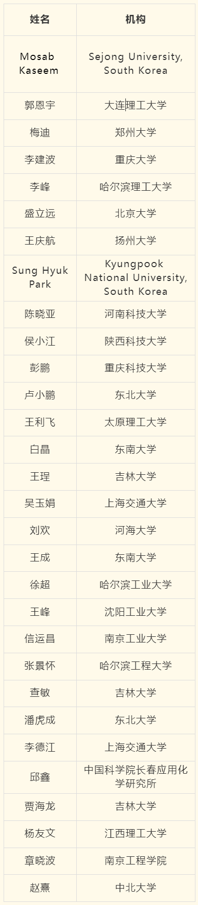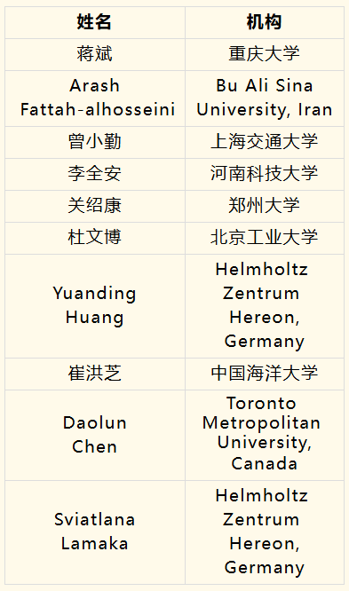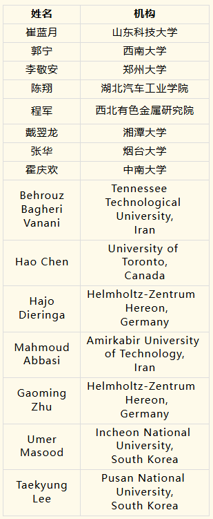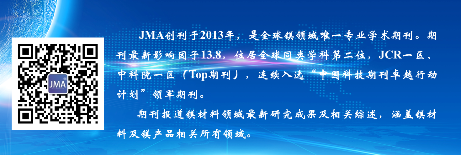 ◆ ◆优秀编委◆ ◆ ◆ ◆优秀青年编委◆ ◆ ◆ ◆优秀审稿人◆ ◆ ◆ ◆最佳论文◆ ◆ (1) Challenges and Opportunities in the Production of Magnesium Parts by Directed Energy Deposition Processes Gürel Çam; Ali Günen 2024, 12(5): 1663-1686 DOI Link: http://dx.doi.org/10.1016/j.jma.2024.05.004 (2) Research Advances of Magnesium and Magnesium Alloys Globally in 2023 Jia She; Jing Chen; Xiaoming Xiong; Yan Yang; Xiaodong Peng; Daolun Chen; Fusheng Pan 2024, 12(9): 3441-3475 DOI Link: http://dx.doi.org/10.1016/j.jma.2024.10.001 (3) Research Progress of Heterogeneous Structure Magnesium Alloys: A Review Xiang Chen; Junlei Zhang; Min Wang; Weizhang Wang; Di Zhao; Haiming Huang; Qi Zhao; Xiaofei Xu; Hongxia Zhang; Guangsheng Huang 2024, 12(6): 2147-2181 DOI Link: http://dx.doi.org/10.1016/j.jma.2024.04.001 (4) The Effect of LPSO Phase on the High-Temperature Oxidation of a Stainless Mg-Y-Al Alloy Zhipeng Wang; Zhao Shen; Yang Liu; Yahuan Zhao; Qingchun Zhu; Yiwen Chen; Jingya Wang; Yangxin Li; Sergio Lozano-Perez; Xiaoqin Zeng 2024, 12(10): 4045-4052 DOI Link: http://dx.doi.org/10.1016/j.jma.2024.07.009 (5) Tailoring the Microstructure of Mg-Al-Sn-Re Alloy Via Friction Stir Processing and the Impact on Its Electrochemical Discharge Behaviour as the Anode for Mg-Air Battery Jingjing Liu; Hao Hu; Tianqi Wu; Jinpeng Chen; Xusheng Yang; Naiguang Wang; Zhicong Shi 2024, 12(4): 1554-1565 DOI Link: http://dx.doi.org/10.1016/j.jma.2022.07.016 (6) Development of Anti-Corrosive Coating on AZ31 Mg Alloy Modified by MOF/LDH/PEO Hybrids Muhammad Ali Khan; Ananda Repycha Safira; Mohammad Aadil; Mosab Kaseem 2024, 12(2): 586-607 DOI Link: http://dx.doi.org/10.1016/j.jma.2023.12.004 (7) Advancements in Enhancing Corrosion Protection of Mg Alloys: A Comprehensive Review on the Synergistic Effects of Combining Inhibitors with Peo Coating Arash Fattah-alhosseini; Abdelhameed Fardosi; Minoo Karbasi; Mosab Kaseem 2024, 12(2): 465-489 DOI Link: http://dx.doi.org/10.1016/j.jma.2024.02.001 (8) In Situ Formation of Multiple Catalysts for Enhancing the Hydrogen Storage of MgH2 by Adding Porous Ni3ZnC0.7/Ni Loaded Carbon Nanotubes Microspheres Bing Zhang; Xiubo Xie; Yukun Wang; Chuanxin Hou; Xueqin Sun; Yuping Zhang; Xiaoyang Yang; Ronghai Yu; Wei Du 2024, 12(3): 1227-1238 DOI Link: http://dx.doi.org/10.1016/j.jma.2022.07.004 ◆ ◆优秀论文◆ ◆ (1) Biomedical Rare-Earth Magnesium Alloy: Current Status and Future Prospects Mingli Yang; Cheng Chen; Dongsheng Wang; Yinjin Shao; Wenhao Zhou; Cijun Shuai; Youwen Yang; Xinghai Ning 2024, 12(4): 1260-1282 DOI Link: http://dx.doi.org/10.1016/j.jma.2024.03.014 (2) Magnesium Oxide (MgO) Nanoadsorbents in Wastewater Treatment: A Comprehensive Review H. C. S. Perera; V. Gurunanthanan; Anoop Singh; M. M. M. G. P. G. Mantilaka; G. Das; Sandeep Arya 2024, 12(5): 1709-1773 DOI Link: http://dx.doi.org/10.1016/j.jma.2024.05.003 (3) A State-of-the-Art Review on Recent Advances in the Fabrication and Characteristics of Magnesium-Based Alloys in Biomedical Applications Fatemeh Zahra Akbarzadeh; Masoud Sarraf; Erfan Rezvani Ghomi; Vishnu Vijay Kumar; Mojtaba Salehi; Seeram Ramakrishna; Sungchul Bae 2024, 12(7): 2569-2594 DOI Link: http://dx.doi.org/10.1016/j.jma.2024.06.015 (4) Towards Designing High Mechanical Performance Low-Alloyed Wrought Magnesium Alloys Via Grain Boundary Segregation Strategy: A Review Zhi Zhang; Jinshu Xie; Jinghuai Zhang; Xu-Sheng Yang; Ruizhi Wu 2024, 12(5): 1774-1791 DOI Link: http://dx.doi.org/10.1016/j.jma.2024.03.016 (5) Well-Oriented Magnesium Hydroxide Nanoplatelets Coating with High Corrosion Resistance and Osteogenesis on Magnesium Alloy Ya Shu; Feng Peng; Zhi-Hui Xie; Qiwen Yong; Liang Wu; Juning Xie; Mei Li 2024, 12(8): 3292-3307 DOI Link: http://dx.doi.org/10.1016/j.jma.2023.02.002 (6) Role of Micro-Ca/in Alloying in Tailoring the Microstructural Characteristics and Discharge Performance of Dilute Mg-Bi-Sn-Based Alloys as Anodes for Mg-Air Batteries Fei-er Shangguan; Wei-li Cheng; Yu-hang Chen; Ze-qin Cui; Hui Yu; Hong-xia Wang; Li-fei Wang; Hang Li; Hua Hou 2024, 12(1): 251-266 DOI Link: http://dx.doi.org/10.1016/j.jma.2022.06.002 (7) Recent Advancements in Thermal Conductivity of Magnesium Alloys Hao Lv; Jun Tan; Qian Yuan; Fanglei Wang; Yunxuan Zhou; Quan Dong; Aitao Tang; Jürgen Eckert; Bin Jiang; Fusheng Pan 2024, 12(5): 1687-1708 DOI Link: http://dx.doi.org/10.1016/j.jma.2024.02.007 (8) Improving Corrosion Resistance of Additively Manufactured WE43 Magnesium Alloy by High Temperature Oxidation for Biodegradable Applications Jinge Liu; Bangzhao Yin; Fei Song; Bingchuan Liu; Bo Peng; Peng Wen; Yun Tian; Yufeng Zheng; Xiaolin Ma; Caimei Wang 2024, 12(3): 940-953 DOI Link: http://dx.doi.org/10.1016/j.jma.2022.08.009 (9) Understanding the Corrosion and Bio-Corrosion Behaviour of Magnesium Composites – a Critical Review Prithivirajan Sekar; S. K. Panigrahi 2024, 12(3): 890-939 DOI Link: http://dx.doi.org/10.1016/j.jma.2024.02.014 (10) Influence of Laser Parameters on the Microstructures and Surface Properties in Laser Surface Modification of Biomedical Magnesium Alloys Chee Ying Tan; Cuie Wen; Hua Qian Ang 2024, 12(1): 72-97 DOI Link: http://dx.doi.org/10.1016/j.jma.2023.12.008 (11) An in-Situ Study of Static Recrystallization in Mg Using High Temperature EBSD Xu Ye; Zhe Suo; Zhonghao Heng; Biao Chen; Qiuming Wei; Junko Umeda; Katsuyoshi Kondoh; Jianghua Shen 2024, 12(4): 1419-1430 DOI Link: http://dx.doi.org/10.1016/j.jma.2023.01.021 (12) High-Throughput Calculations Combining Machine Learning to Investigate the Corrosion Properties of Binary Mg Alloys Yaowei Wang; Tian Xie; Qingli Tang; Mingxu Wang; Tao Ying; Hong Zhu; Xiaoqin Zeng 2024, 12(4): 1406-1418 DOI Link: http://dx.doi.org/10.1016/j.jma.2021.12.007 (13) Twinning Aspects and Their Efficient Roles in Wrought Mg Alloys: A Comprehensive Review S. S. A. Shah; Manping Liu; Azim Khan; Farooq Ahmad; M. R. Abdullah; Xingquan Zhang; Shiwei Xu; Zhen Peng 2024, 1