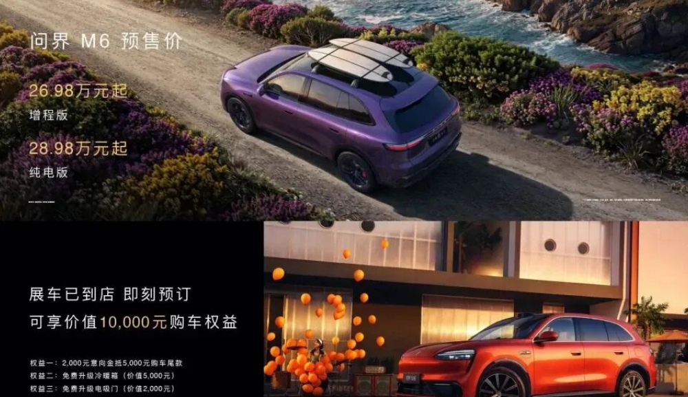 2026年3月29日,鸿蒙智行正式公布问界M6全系标配配置。该车型定位“新锐智慧SUV”,提供增程版和纯电版两种动力形式,预售价分别为26.98万元起和28.98万元起。值得注意的是,车身高强度钢占比83.62%,A柱采用2000MPa热成型钢,国内首发半固态镁合金结构件(减重 20%);标配9气囊(含中央远端气囊)及门把手三重机械应急开启设计。