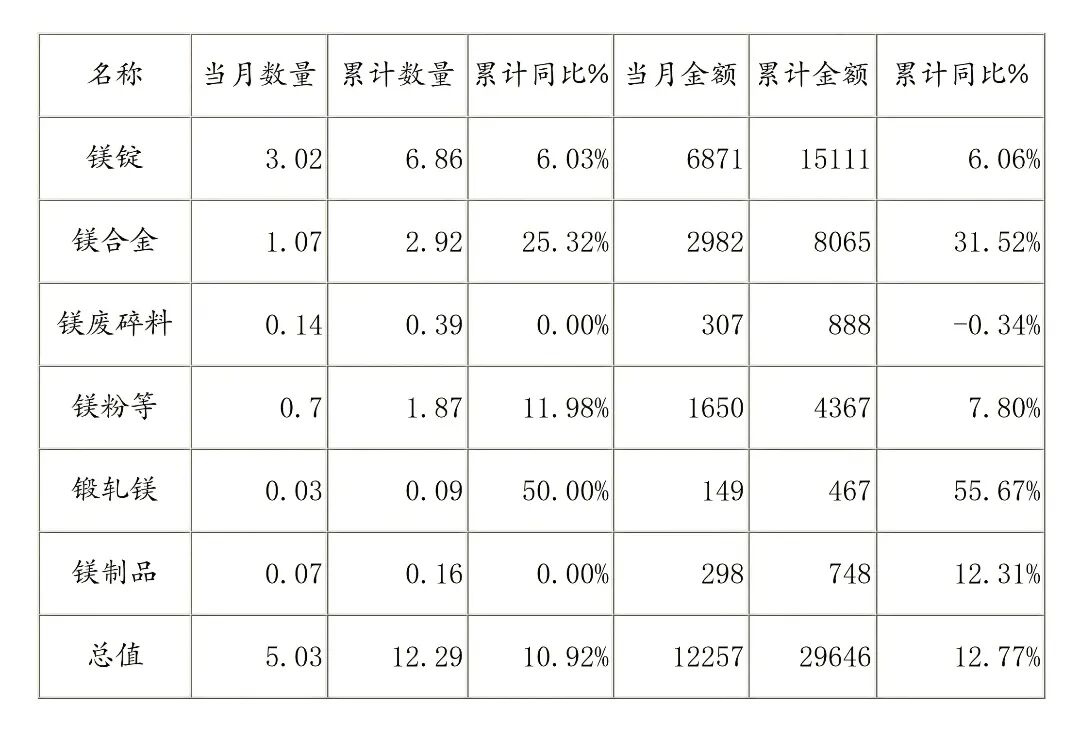 2. 产品结构持续优化:镁合金、锻轧镁等高附加值产品出口增速显著高于传统镁锭,成为拉动出口增长的主要动力,产业结构优化成效初显。