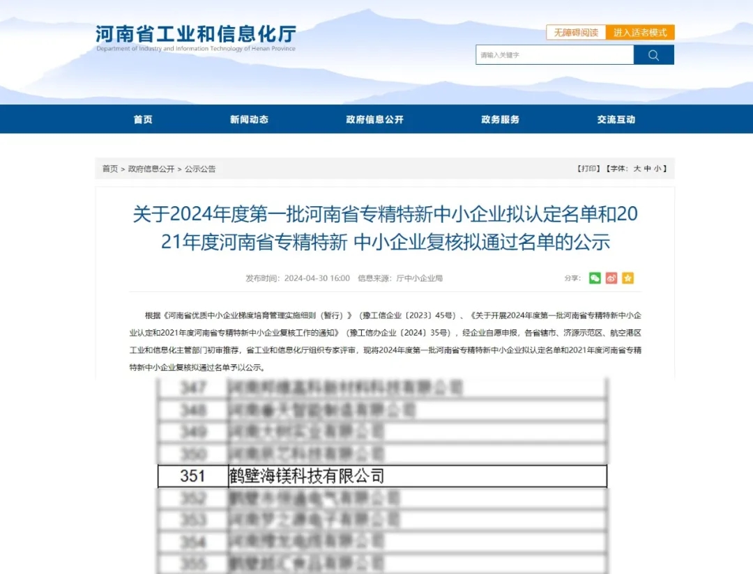 近日,河南省工业和信息化厅公示了《关于2024年度第一批河南省专精特新中小企业拟认定名单和2021年度河南省专精特新中小企业复核拟通过名单的公示》,海骊新材料-鹤壁海镁科技有限公司被认定为“河南省专精特新中小企业”。