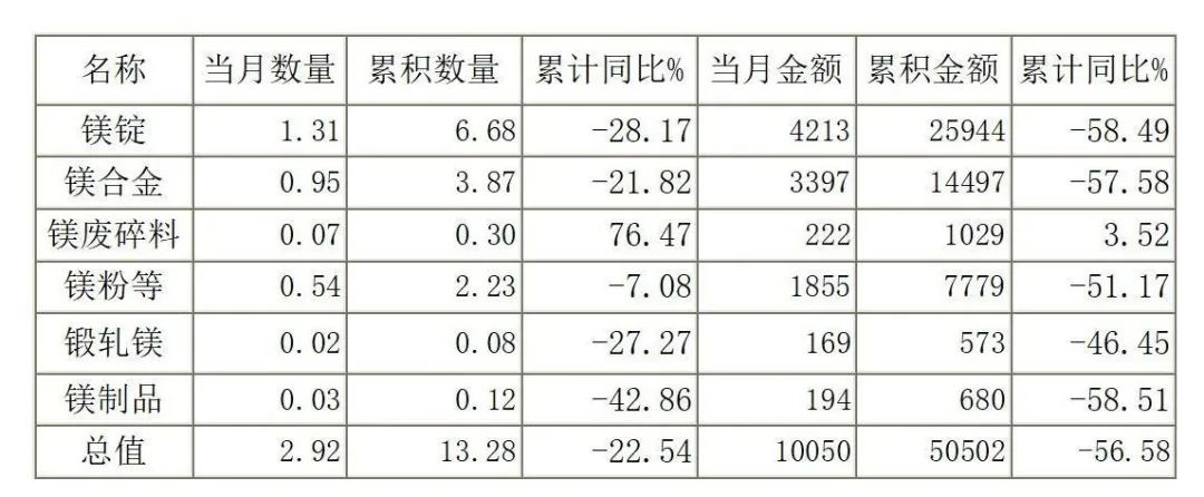 2023年1—4月中国共出口各类镁产品13.28万吨