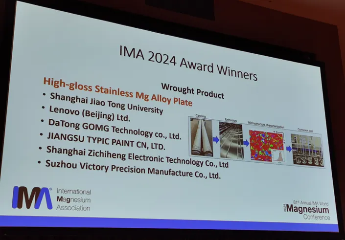 2024年5月20日,在日本福冈举办的第81届世界镁行业大会上,国际镁协(IMA)评奖委员会宣布,上海交通大学联合联想集团等单位合作完成的“高亮不锈镁”项目荣获2024年国际镁协“优秀变形镁合金产品奖”。