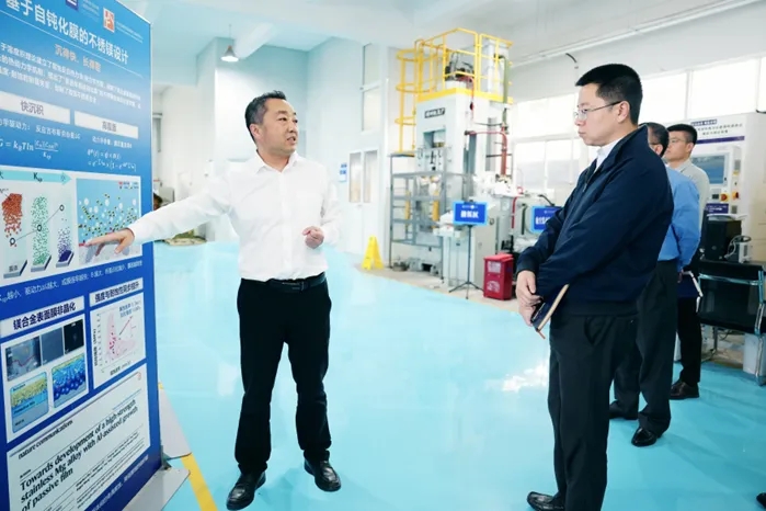 得知中心在高性能不锈镁领域取得了多项世界级的基础及应用研究重大突破时,屈主任饶有兴致地详细询问了不锈镁的设计理念、抗腐蚀机理和耐蚀水平,还全面调研了不锈镁在航空航天、新能源汽车、3C电子等多个领域的实际应用情况。