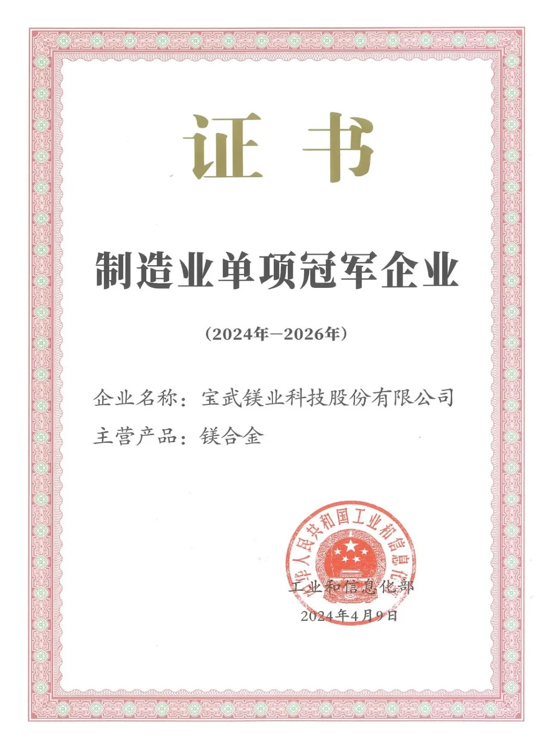 近日,工信部公布第八批制造业单项冠军企业认定及第二批、第五批制造业单项冠军复核名单,宝武镁业科技股份有限公司(以下简称“宝武镁业”)凭借拳头产品“镁合金”再次荣耀登榜。国家级制造业单项冠军被誉为制造业“皇冠上的明珠”,是我国制造业核心竞争力的体现。本次复核通过制造业单项冠军企业,标志着宝武镁业在制造业细分领域具备较高的发展水平、较强的市场实力和领先的创新能力,体现了公司在技术创新、产品质量、市场竞争力、产业链整合和可持续发展等方面的显著优势势。