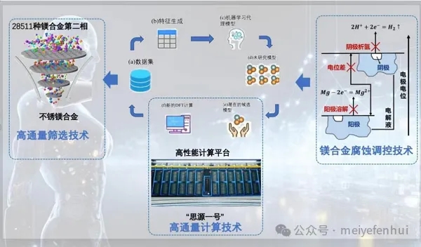 上海交通大学丁文江院士、曾小勤教授领衔的上海镁材料及应用工程技术研究中心团队,多年来一直在探索镁合金新材料研发的无人区,不断突破镁合金性能瓶颈,曾获得“2020年国家技术发明一等奖”、两次获得“中国有色金属工业科学技术一等奖”等多项国家级、省部级大奖。近年来,团队将人工智能高通量计算与材料基因工程技术相融合,提出了“降低电位差,抑制阴阳极”的不锈镁设计模型,实现了低电位差合金相高通量筛选和不锈镁成分优化设计,相较于传统基于经验试错的开发方法,研制周期和费用减少了五分之四。