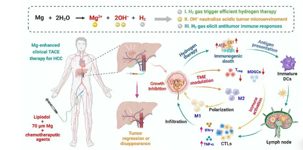 与此同时,镁微球缓慢反应释放氢气和氢氧化镁,可以中和肿瘤弱酸性、逆转免疫抑制并激活T细胞介导的抗肿瘤免疫反应。在新西兰兔原位肝肿瘤模型中,基于镁微球的新型TACE疗法(M-TACE)效果显著优于cTACE和D-TACE,进一步证实了镁微球增效介入栓塞治疗的潜力。