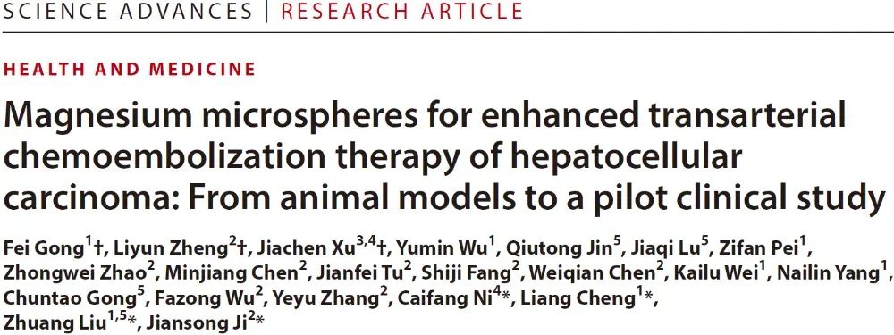 近日,苏州大学刘庄教授、程亮教授研究团队联合丽水市中心医院纪建松教授及苏大附一院倪才方教授在Science Advances上发表题为Magnesium Microspheres for Enhanced Transarterial Chemo-Embolization Therapy of Hepatocellular Carcinoma: from Animal Models to a Pilot Clinical Study的研究。该研究创新性地利用金属镁微球作为一款新型的栓塞制剂,旨在解决临床介入栓塞治疗的问题并提升其治疗效果。