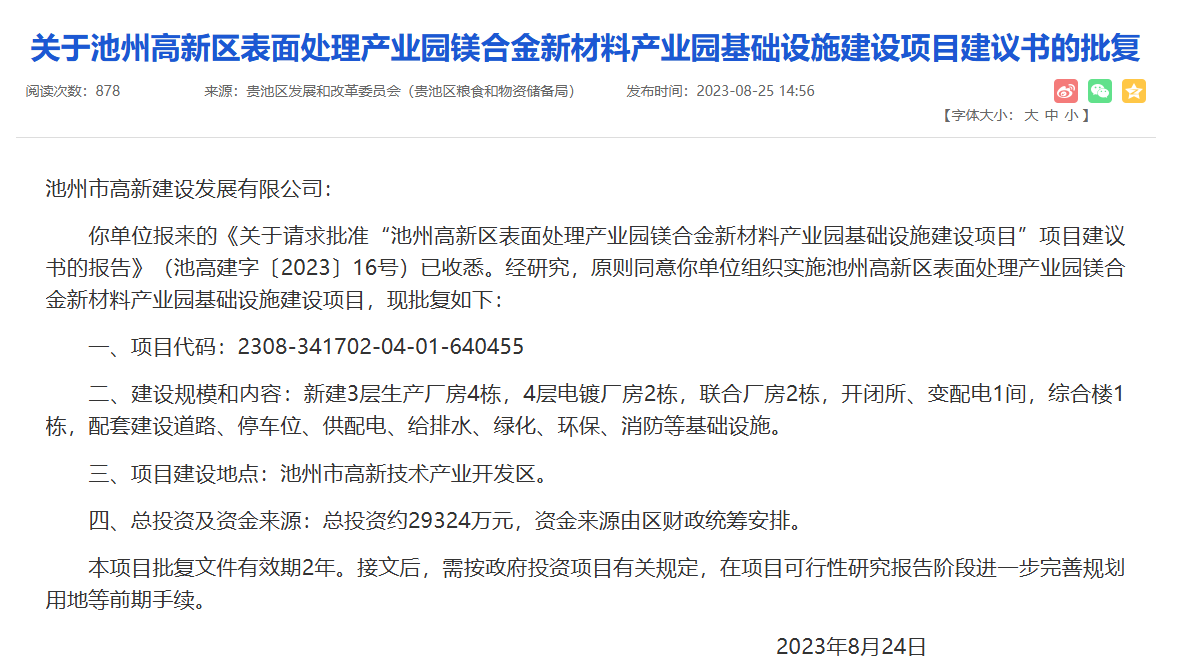 池州高新区表面处理产业园镁合金新材料产业园基础设施建设项目建议书批复