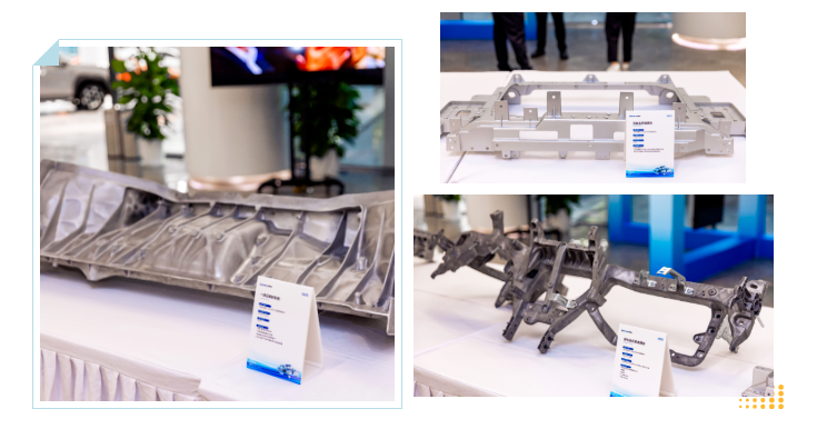 本次技术展集中展示了宝武镁业及其旗下博奥镁铝在汽车轻量化领域的前沿材料、先进工艺与系统解决方案。展品涵盖车身系统、座舱、电池系统、电驱系统、底盘系统等新能源汽车关键领域,包括镁合金仪表板横梁、镁合金后地板前段盖板组件、镁合金座椅靠背、镁合金踏板骨架、镁合金中控支架等一系列“硬核”成果。这些展品直观体现了镁铝合金在减重、提效、降耗方面的卓越性能,充分彰显了宝武镁业雄厚的技术实力。