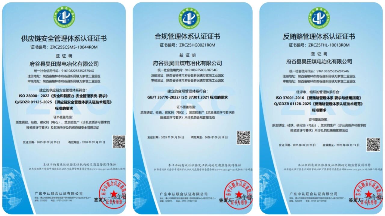 近日,府谷昊田公司凭借在供应链安全、反贿赂及合规管理方面的卓越表现,顺利通过第三方权威机构的综合评审,荣获供应链安全管理体系(ISO 28000)、反贿赂管理体系(ISO 37001)及合规管理体系(ISO 37301)认证证书。