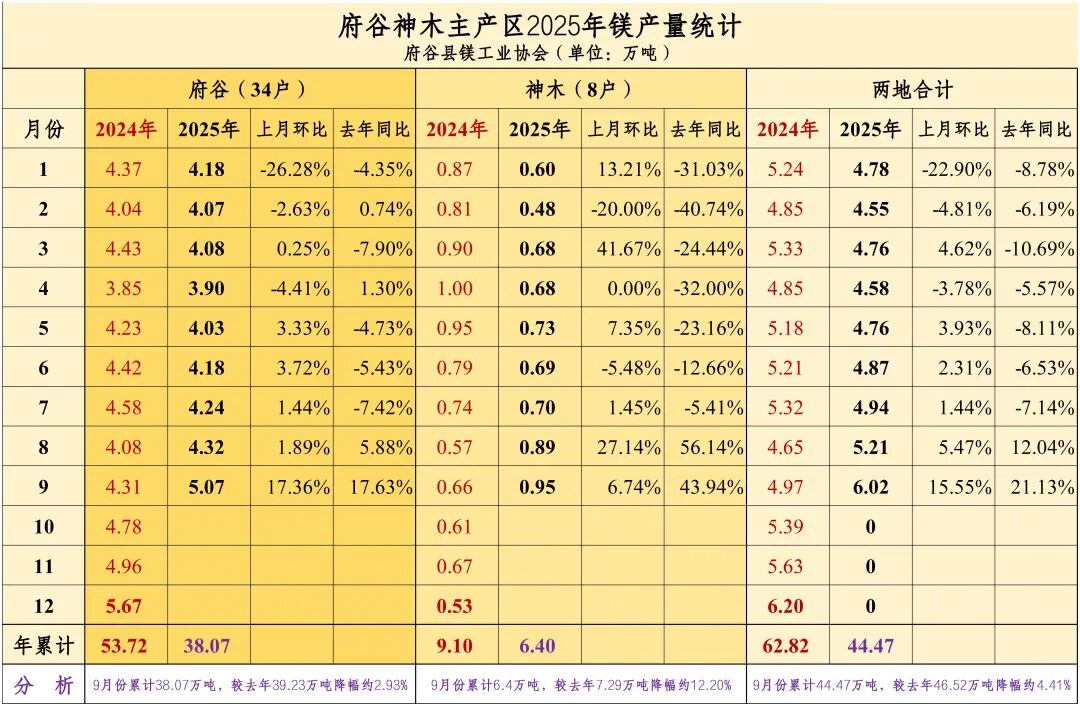 两地镁产量合计2025年9月份产量6.02万吨,2025年前9月累计44.47万吨。上月环比:较2025年8月份5.21万吨的产量,增加0.86万吨,增幅15.55%。去年同比:较2024年9月份4.97万吨的产量,增加1.05万吨,增幅21.13%。累计同比:较2024年同期累计产量46.52万吨,减少2.05万吨,降幅4.41%。