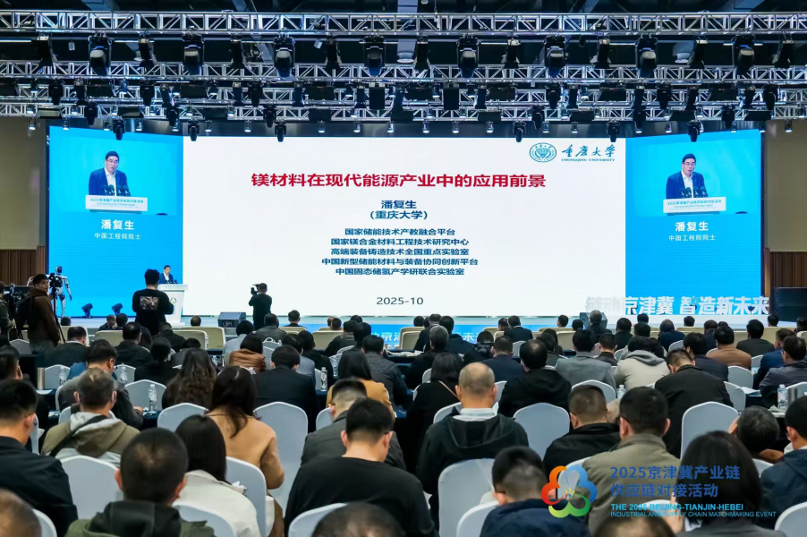 10月28日,以“链动京津冀 智造新未来”为主题的2025京津冀产业链供应链对接活动在河北廊坊盛大开幕。中国工程院院士,明月湖实验室负责人、首席科学家潘复生应邀出席大会并作题为《镁材料在现代能源产业中的应用前景》的主旨报告,分享了明月湖实验室在镁基材料领域的前沿成果,并为京津冀产业协同发展贡献了“镁”的智慧。