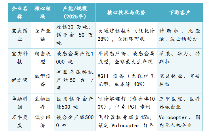 2.中游(材料与加工):到2025 年,镁合金产能将达到 50 万吨,宝武镁业的市场占有率超过 40%;半固态压铸、3D 打印设备的国产化率达到 50%,伊之密 MGII 成型机的合模次数超过 500 万次,废品率降低 30%。