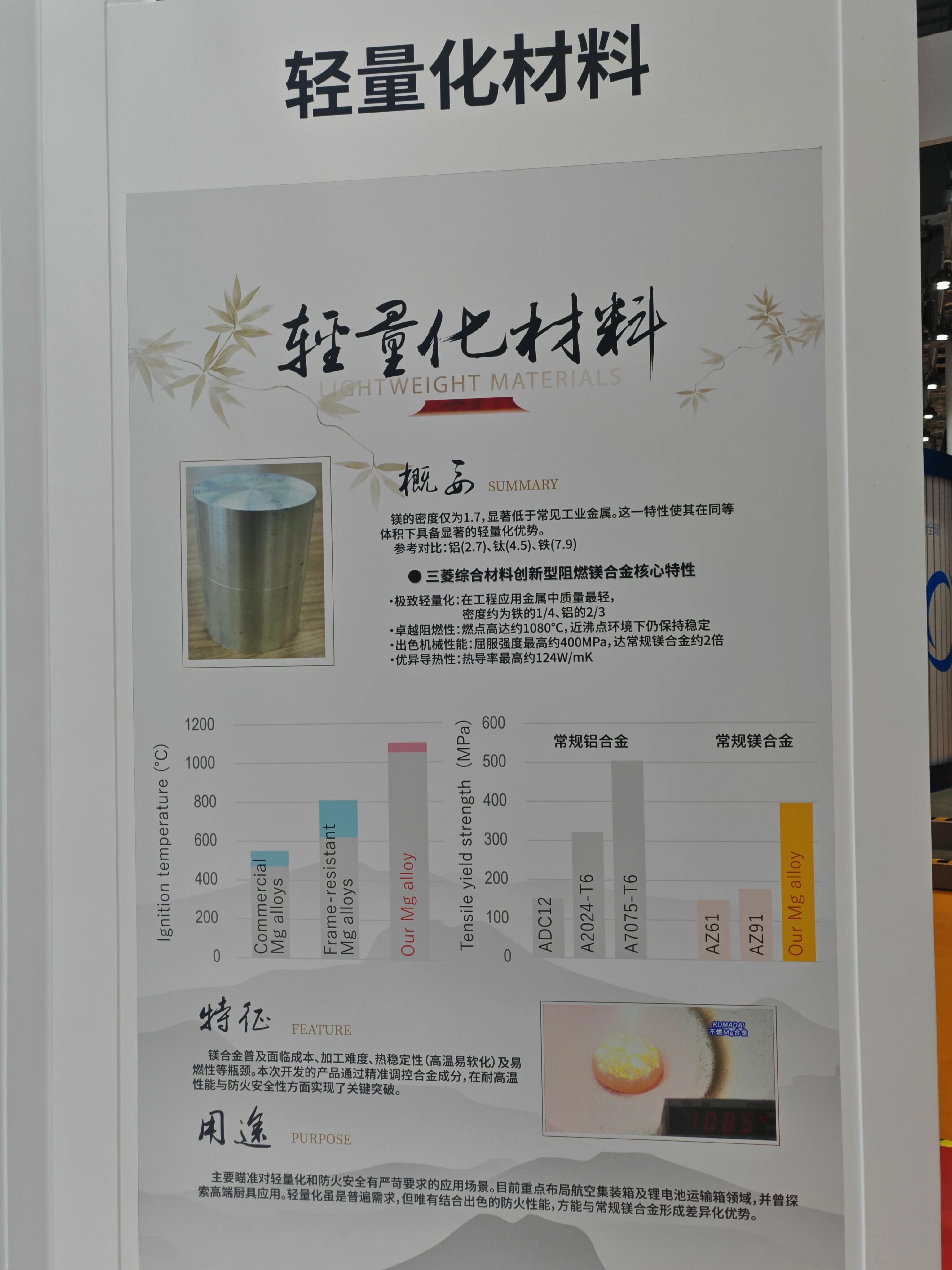 创新型阻燃镁合金,其核心特性在于燃点高达约1080℃,近沸点环境下仍保持稳定;在工程应用金属中质量最轻,密度约为铁的1/4、铝的2/3;屈服强度最高约400MPa,达常规镁合金约2倍;热导率最高约124W/mK。据介绍,该产品主要瞄准对轻量化和防火安全有严苛要求的应用场景,目前重点布局航空集装箱及锂电池运输箱领域,并曾探索高端厨具应用。轻量化虽是普遍需求,但唯有结合出色的防火性能,方能与常规镁合金形成差异化优势。