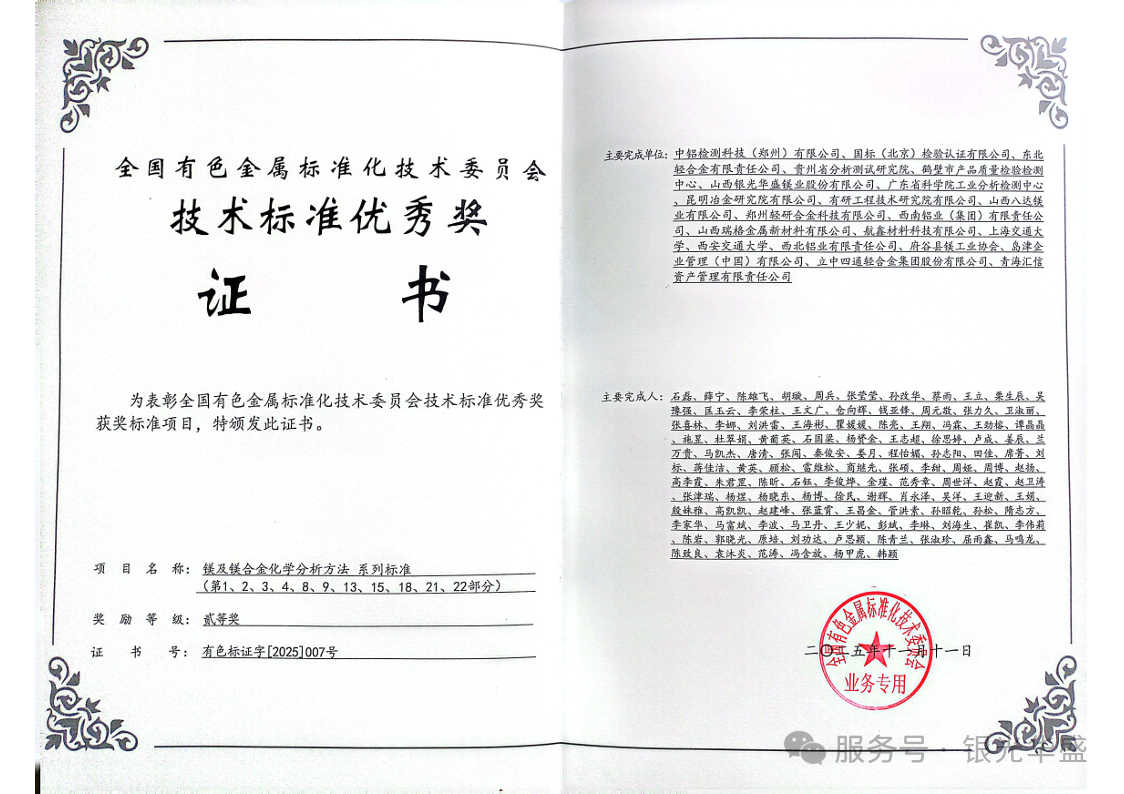 近期参与修订的《镁及镁合金化学分析方法 系列标准》获得优秀标准二等奖,用技术创新定义行业标杆。