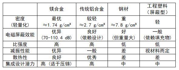 电驱系统壳体:宝武镁业与汇川联合动力发布的镁合金电驱总成、上汽集团发布的半固态成型镁合金电驱壳体,都利用了镁合金的轻量化和屏蔽性来提升功率密度并控制电磁干扰。