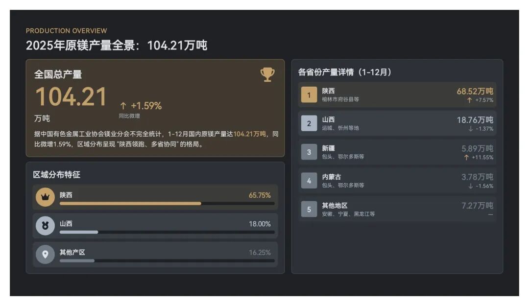1-12月国内原镁产量达104.21万吨,同比微增1.59%,区域分布呈现“陕西领跑、多省协同”的格局,