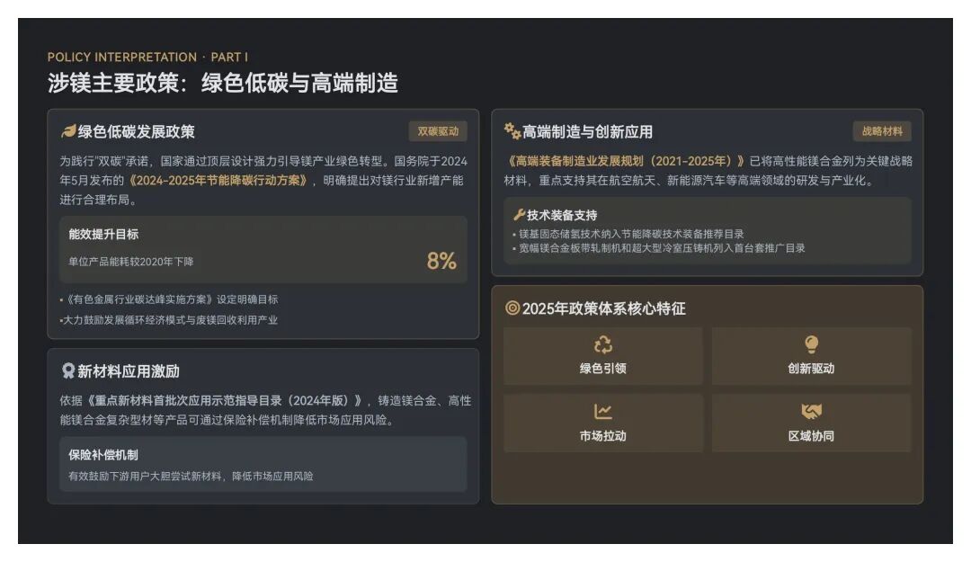 1. 绿色低碳发展政策:为践行“双碳”承诺,国家通过顶层设计强力引导镁产业绿色转型。国务院于2024年5月发布的《2024-2025年节能降碳行动方案》,明确提出对镁行业新增产能进行合理布局。根据《有色金属行业碳达峰实施方案》等政策文件要求,我国设定了明确的能效提升与碳减排目标:镁行业单位产品能耗需较2020年下降8%左右,并显著提升碳减排成效。旨在推动行业绿色低碳转型,提升可持续发展水平。还大力鼓励发展循环经济模式与废镁回收利用产业,推动全生命周期绿色发展。