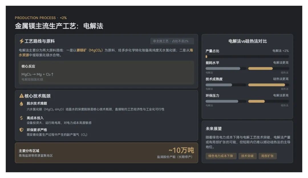 电解法镁冶炼主要分为两大原料路线:一是以菱镁矿(MgCO₃)为原料,经多步化学转化制备高纯度无水氯化镁(MgCl₂);二是从海水资源中提取氯化镁水合物,其核心技术瓶颈在于六水氯化镁(MgCl₂·6H₂O)结晶水的深度脱除,直接制约工艺经济性与工业化可行性。该工艺还存在设备投资大、运行耗电高、环保要求严等问题,尤其需妥善处置生产过程中产生的副产氯气。目前我国电解法商品原镁产量占比不足2%,主要集中在青海盐湖等资源富集地区。随着绿色电力成本下降与电解工艺技术突破,电解法产量或有局部扩张的可能,但短期内仍难以撼动硅热法的主导地位。