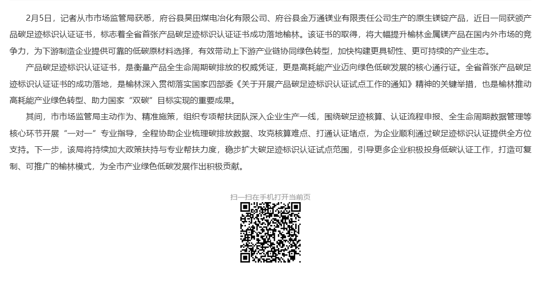 2月5日,府谷县昊田煤电冶化有限公司、府谷县金万通镁业有限责任公司生产的原生镁锭产品,近日一同获颁产品碳足迹标识认证证书,标志着全省首张产品碳足迹标识认证证书成功落地榆林。该证书的取得,将大幅提升榆林金属镁产品在国内外市场的竞争力,为下游制造企业提供可靠的低碳原材料选择,有效带动上下游产业链协同绿色转型,加快构建更具韧性、更可持续的产业生态。
