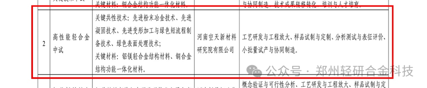 河南空天新材料研究院有限公司(简称“空天院”)凭借在“高性能轻合金中试”领域深厚的技术积淀与创新能力成功入选。