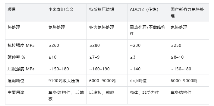 通过该表格,我们能看出,小米泰坦合金还是具备一定优势的: ■ 小米泰坦合金:走高韧性+免热处理路线,更强调抗冲击、抗变形,适合大压铸车身结构件。 ■ 特斯拉系:更偏高强度,韧性略低于泰坦。 ■ ADC12:便宜、好铸,但脆、强度低,不能当主承载车身件。 ■ 国产新势力免热处理:整体和泰坦接近,但成分、稀土/微量元素配比各有专利壁垒。