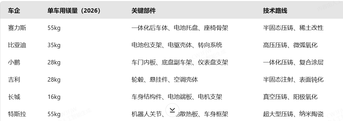 2026年主流车企规划单车用镁量从15-25kg提升至45-55kg