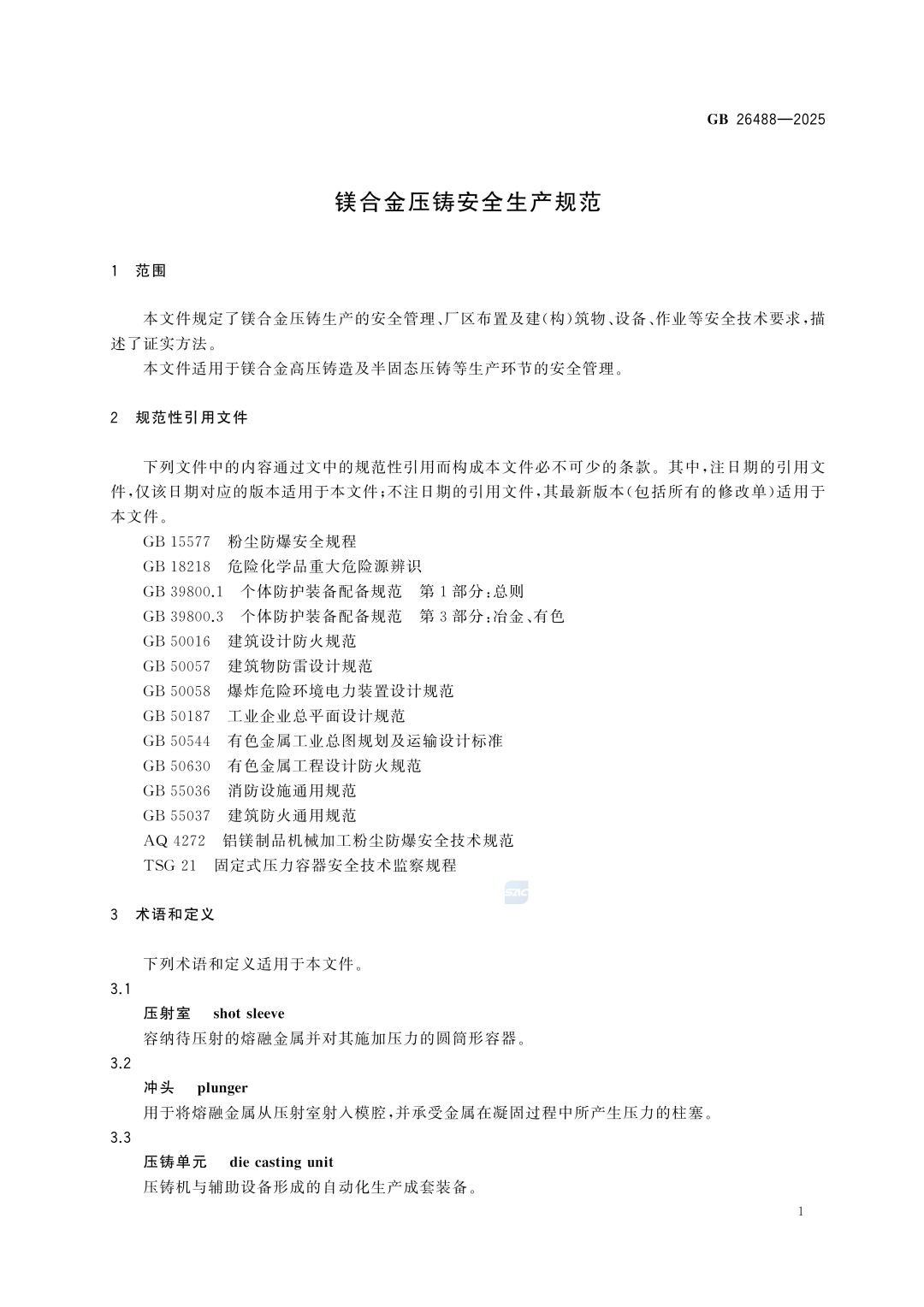 国家标准《镁合金压铸安全生产规范》(GB 26488—2025)