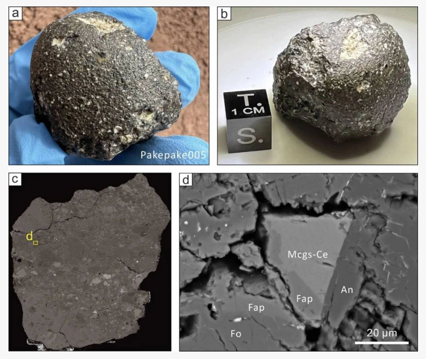 a-b: Pakepake005月球陨石, c: Pakepake005陨石切片电镜照片, d: 铈镁嫦娥石及其共生矿物。