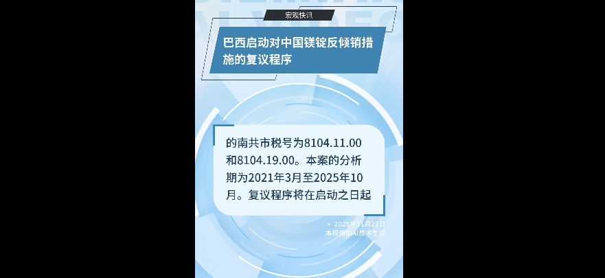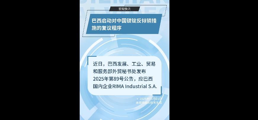2025年11月13日,巴西发展、工业、贸易和服务部外贸秘书处(Ministério do Desenvolvimento, Indústria, Comércio e Serviços/Secretaria de Comércio Exterior)发布2025年第89号公告,应巴西国内企业RIMA Industrial S.A.于2025年3月28日提交的申请,就2021年第253号决议裁定的对原产于中国的镁锭(葡萄牙语:magnésio metálico em formas brutas)的反倾销措施启动复议程序。涉案产品的南共市税号为8104.11.00和8104.19.00。