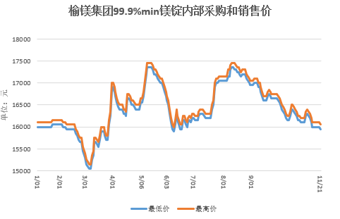 11月21日(周五),99.9%镁锭府谷地区主流出厂含税现金价格15950——16050元/吨,较昨日下跌50元/吨。月初至今,供应增加而需求整体疲软,镁价承压回落,目前处于年度低位。 今日下游仍维持按需采购,成交氛围冷清,镁市于谷底平稳运行,在近期低位走稳的市场行情下,出货情况勉强可以维持。