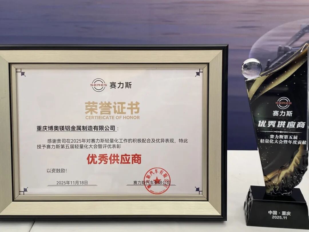 会议期间,赛力斯对在轻量化工作中作出突出贡献的供应商进行了隆重表彰。经过严格评审,共有十家优秀供应商脱颖而出,荣获“年度优秀供应商”称号。其中,重庆博奥镁铝金属制造有限公司凭借其卓越的产品轻量化成果及稳定的质量表现,成为获奖企业之一,彰显了其在轻量化材料领域的深厚实力。