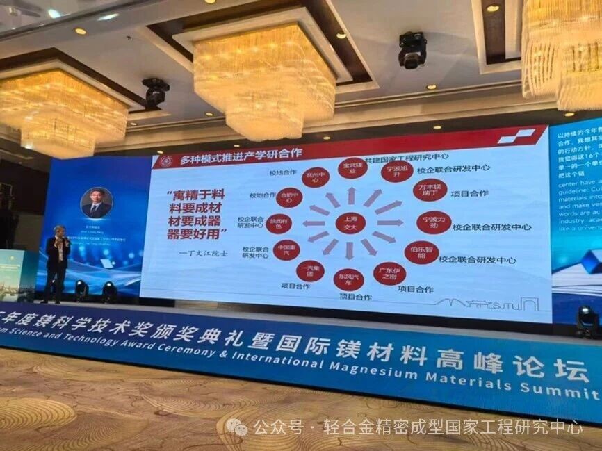 在国际镁材料高峰论坛上,轻合金研究所所长彭立明教授应邀做了题为“上海交通大学镁合金产学研合作情况”的报告,详细介绍了上海交通大学轻合金精密成型国家工程研究中心数十年来秉承的“寓精于料、料要成材、材要成器、器要好用”研发精神,并采用多种合作模式将这种精神落实到产学研用合作当中去,最后介绍了上海交大在镁基结构材料、能源材料、生物材料、镁氢农业等方面成功合作的典型案例,受到参会专家和听众的高度评价。