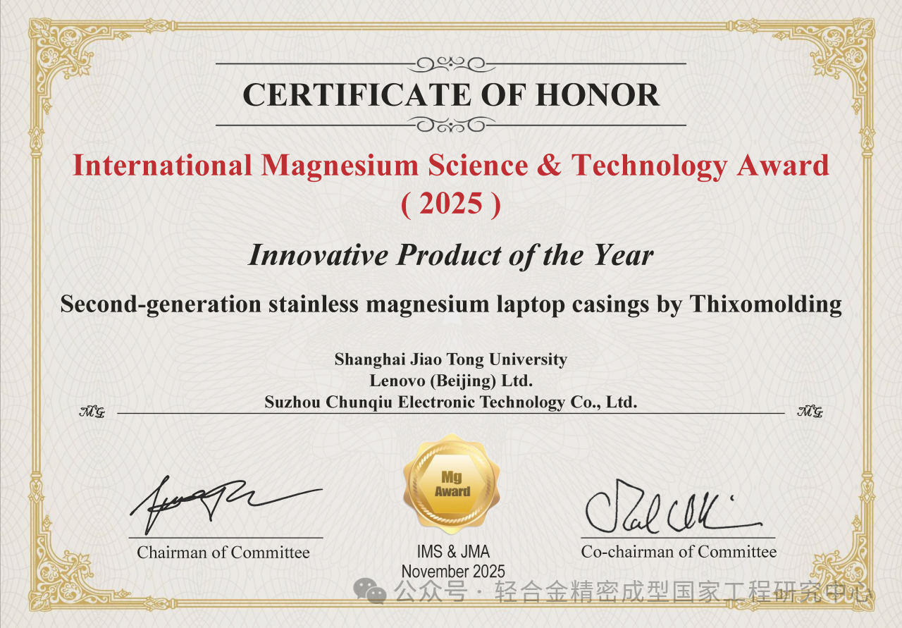 曾小勤教授团队牵头申报的“Second-generation stainless magnesium laptop casings by Thixomolding”荣获年度创新产品奖(Innovative Product of the Year)。曾小勤教授团队与联想集团开展产学研合作,成功推动了不锈镁合金在消费电子领域的应用。继第一代变形镁合金成功应用于型号Thinkbook X IMH,摘得国际镁协(IMA)2024年度最佳变形产品奖,本年度推出的YogaBook 9i,采用了半固态注射成型工艺,制造成本降低50%以上,是团队在新材料制造领域的又一大突破。